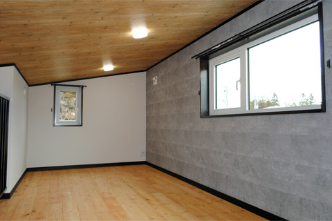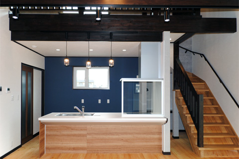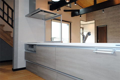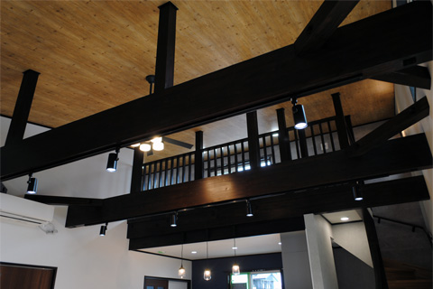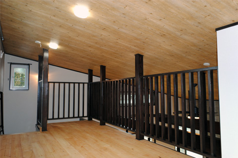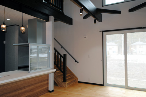 平屋の部分が主ですが、一部2階建ての部分は斜め天井で屋根裏部屋のようなワクワク感があります。ダイナミックに梁を見せた開放感のあるリビングは家族でゆったりとした時間が過ごせそうです。