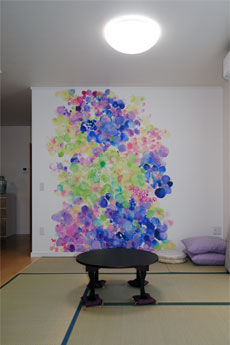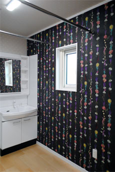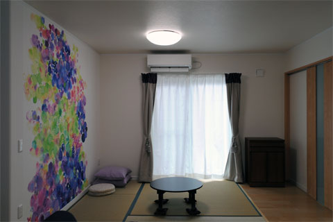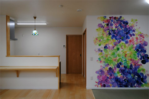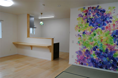 室内は好きなカラーを取り入れてインテリアのアクセントにしました。リビングにはやわらかな印象の抽象画で作られた壁紙を施工。アートのある暮らしを楽しむことができます。