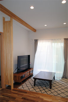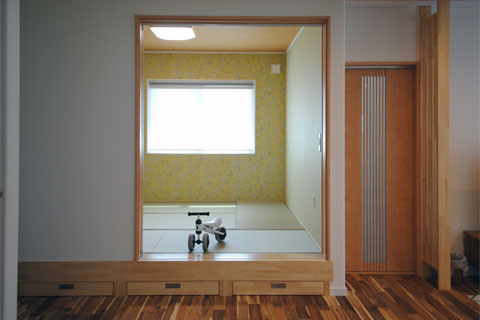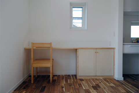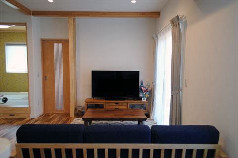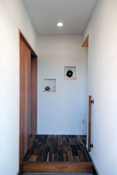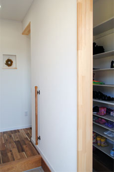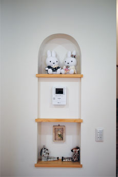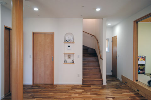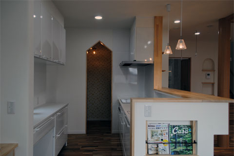 まぁるい大黒柱、ニッチやカウンターなどの造作、思わずにっこり笑顔になるポイントが随所に散りばめられています。動線を考え、使う場所に使うものがしまえる収納スペースを確保していることで、いつもきれいな我が家を現実に。お住まいのご家族がストレスのない健康的な毎日が過ごせますように。